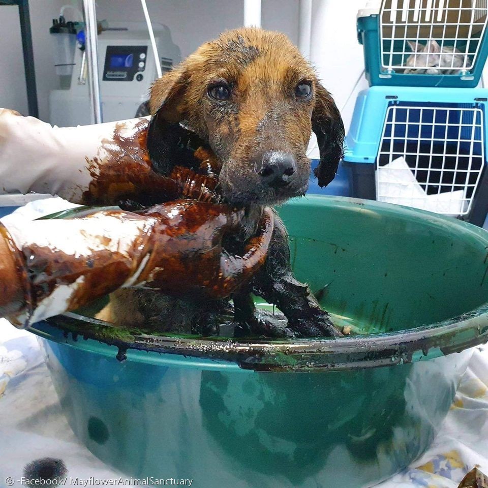 다행히 수의사와 루마니아 동물단체 애니스 트러스트가 특수 윤활유로 타르를 모두 씻어내고, 강아지를 치료하기 시작했다.