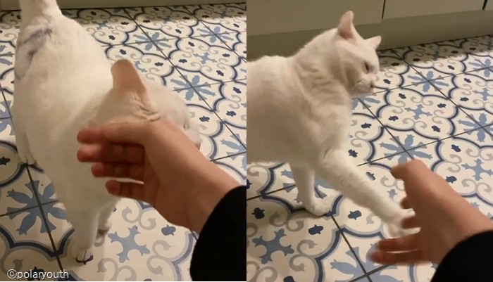 [노트펫] 집사의 손을 보고 몸을 비비러 왔다가 갑자기 돌변해 불주먹을 날린 냥이의 행동에 집사는 혼란에 빠졌다.