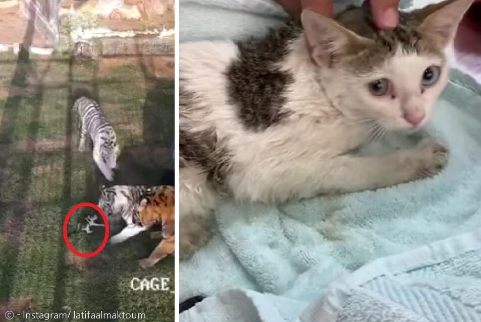 [노트펫] 새끼 길고양이가 두바이 공주의 호랑이 우리에 들어갔다가 호랑이 3마리에게 죽을 뻔한 위기를 넘기고, 두바이 공주에게 입양됐다.
