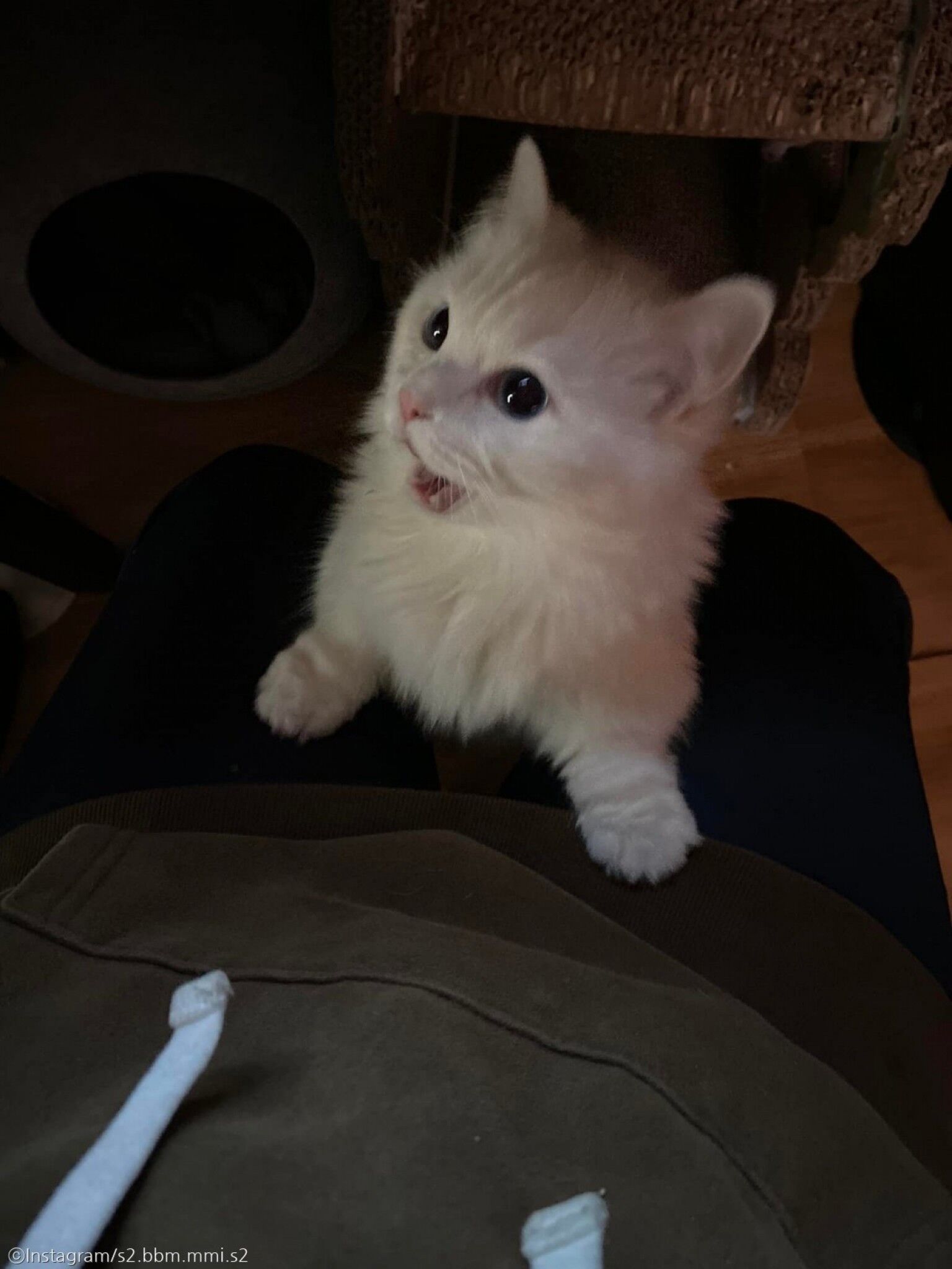 공개된 사진 속에는 집사의 무릎 위에 올라와 있는 쁘미의 모습이 담겼다.
