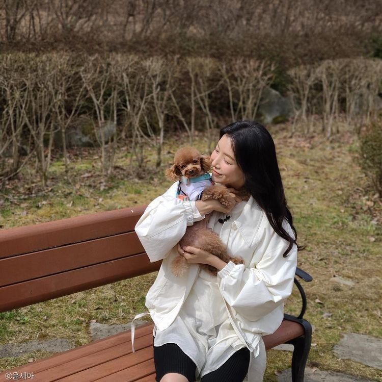 공개된 사진 속에서 윤세아는 벤치에 앉아 뽀그리야를 품에 안고 애정표현을 하는 모습이다.