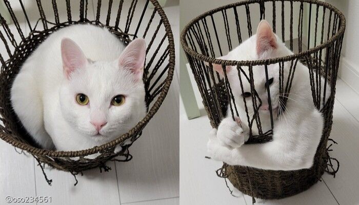 그러던 어느 날 여느 때와 다름없이 바구니 안에 들어간 녀석은 바구니를 뜯지 않고 집사를 빤히 쳐다봤다.