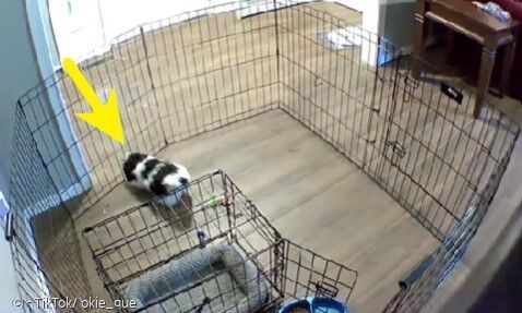 강아지의 주인은 어떻게 강아지가 높은 놀이울타리를 탈출했는지 궁금했다. 그래서 홈카메라를 설치해서 살펴봤더니, 강아지가 바로 이렇게 탈출했다.