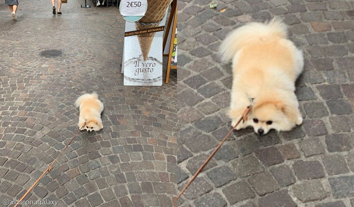 [노트펫] 보호자가 집에 가자고 말하자 산책을 더 즐기고 싶었던 강아지는 바닥에 납작 엎드려 버렸다. 그 모습이 꼭 녹아내린 아이스크림 같다.