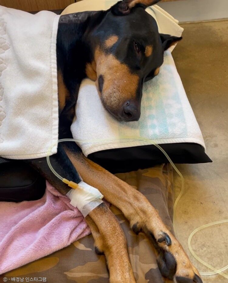 배정남은 지난 27일 자신의 인스타그램을 통해 링거를 맞으며 힘없이 누워있는 벨의 영상을 공개했다.