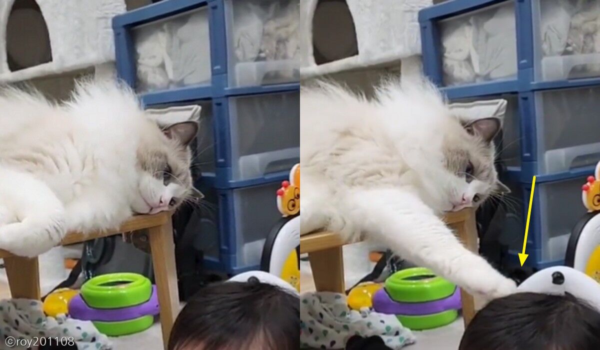 한참 지켜보던 녀석은 갑자기 한쪽 앞발을 뻗어 아기 집사의 머리를 부드럽게 쓰다듬었다.