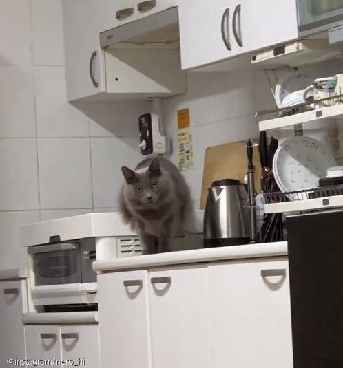 네로는 안 움직인 척 가만히 있었지만 분명히 조금씩 위치가 바뀐 모습이다. 이어 한 발씩 움직여 부엌 아래로 내려오는 녀석.