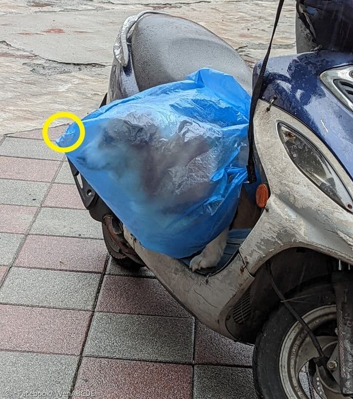 2023.06.26 15:45:59 김국헌 기자 papercut@inbnet.co.kr 견주가 오토바이에 태운 반려견에게 비닐봉지를 씌우고, 모서리에 구멍을 뚫어 숨구멍(노란 원)도 만들어줬다. [출처: 타이완 수의사의 페이스북]