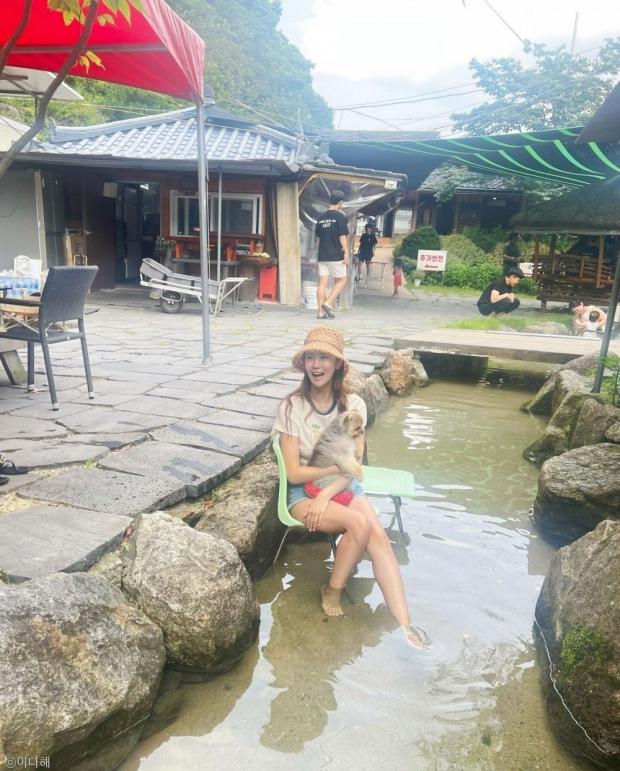 공개된 사진 속에서 이다혜는 그레이튼을 품에 안고 물에 발을 담그고 있다.