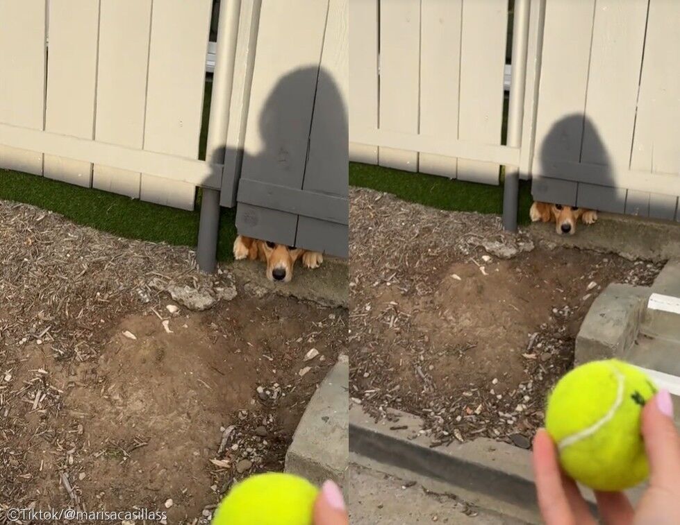 울타리 아래로 머리를 최대한 내밀고 있는 리트리버. 알고 보니 녀석의 테니스공이 울타리 아래에서 빠져 거리까지 굴러 나와 있던 건데.