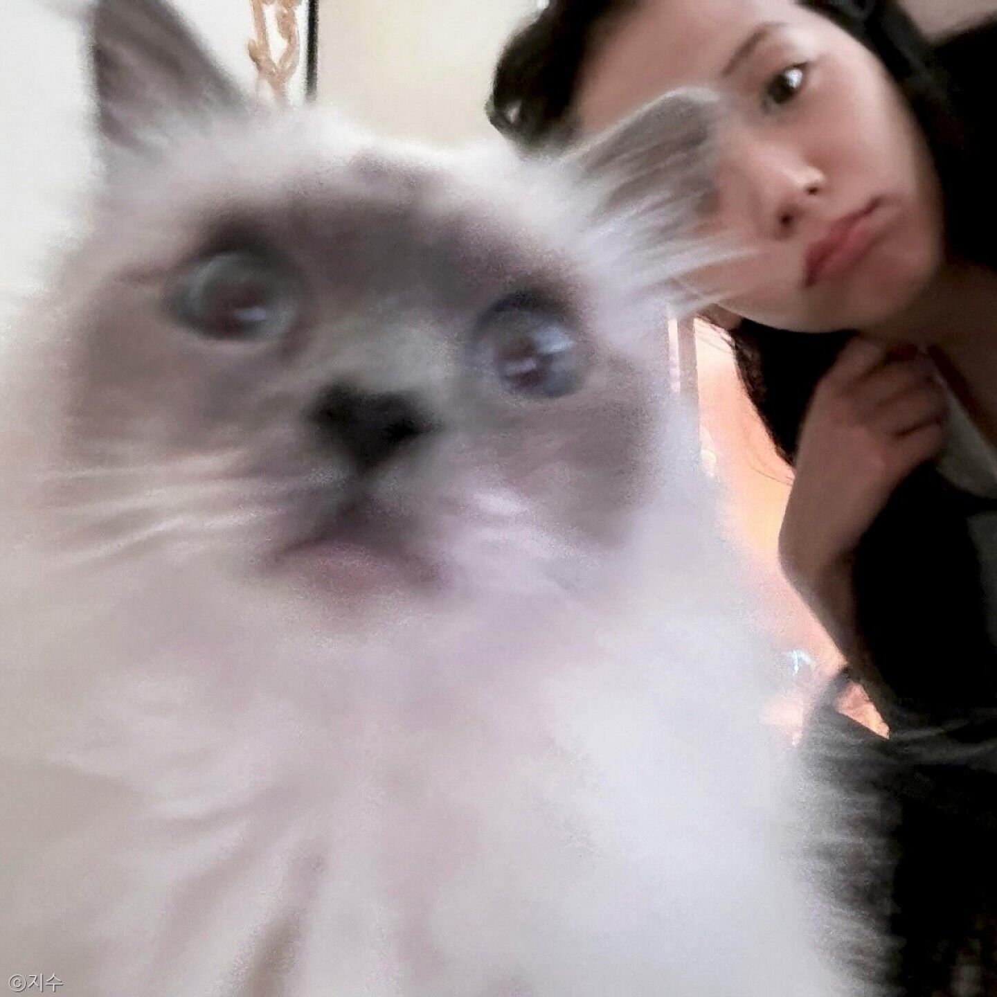 놀란 듯 커다란 눈망울로 카메라를 바라보는 고양이와 그 곁에서 미모를 뽐내는 지수의 모습이 더없이 사랑스럽기만 하다.