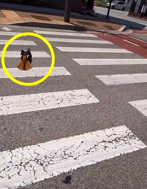 횡단보도를 건너던 뽀무의 머리 위로 빠르게 날아오는 딱새. 부리로 잽싸게 뽀무를 공격하고 후퇴하는 반복 공격에 뽀무는 속수무책으로 당하는 모습이다.