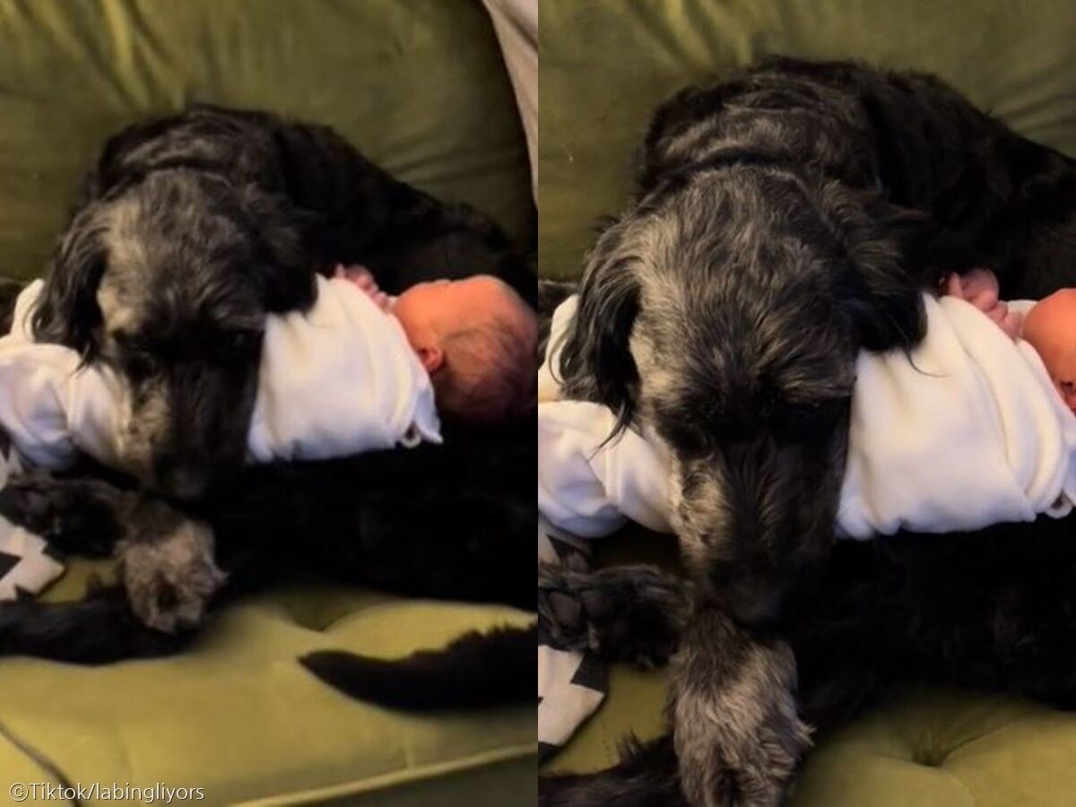신생아 남동생 끌어안은 형아 반려견 '엄마처럼 따뜻하게'