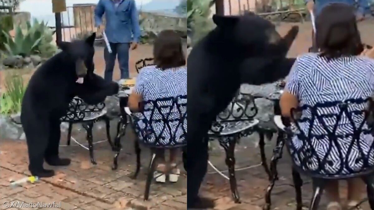 당시 한 부부가 호텔 야외 테라스에서 식사를 하고 있었다. 그런데 배고픈 흑곰이 갑자기 나타나 테이블에 있던 음식을 먹기 시작했다.