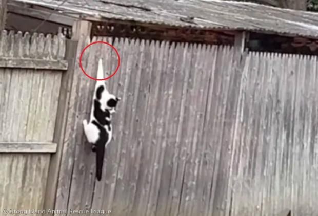 지난 2월, 울타리 나무판자 사이에 발이 끼인 채 매달려있는 고양이 한 마리가 발견됐다. 지역 경찰은 동물 구조 전문단체 스트롱 아일랜드 동물 구조 연맹(Strong Island Animal Rescue League)에 긴급하게 도움을 청했다.