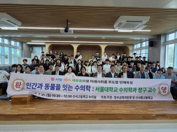 21일 진행된 이번 특강은 서울대학교 수의과대학 장구 교수를 초청해 ‘인간과 동물을 잇는 수의학’을 주제로 진행됐다. 장 교수는 동물과 인간의 생명, 질병, 공존을 연결하는 수의학의 역할과 미래 가능성에 관해 풍부한 사례와 함께 설명했다. 학생들에게 진로 탐색의 새로운 방향을 제시했다는 게 장수교육지원청의 설명이다.
