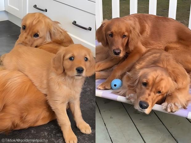 녀석은 소파처럼 언니 리트리버 '파차(Pacha)'의 몸 위에 올라갔는데요. 이때까진 짓궂긴 해도 사랑스러웠답니다.