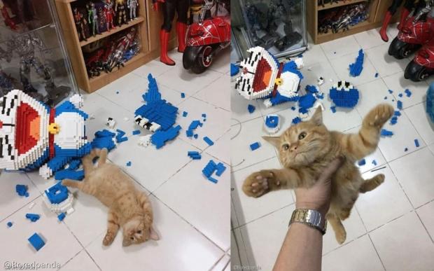 지난 2020년, 미국 온라인 예술잡지 보어드판다는 장난감 가게에서 일하는 남성이 고객의 주문으로 2,432조각을 조립해 완성한 도라에몽 피규어를 반려묘가 부숴버렸다고 보도했습니다.
