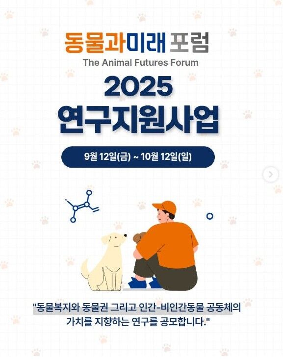 신청자는 소정의 연구 계획서를 작성해 제출하면 된다. 신청은 오는 9월 12일부터 10월 12일까지 가능하다. 연구지원사업에 선정된 연구자는 올해 말에 열리는 동물과미래포럼 창립식에서 연구 계획을 발표하고, 연구 결과는 내년 가을로 계획된 정기 포럼에서 보고하게 된다.