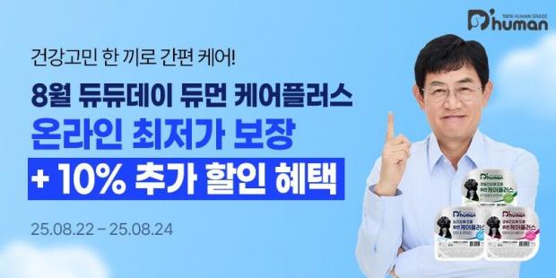 듀먼에 따르면, 이번 8월 듀듀데이는 이어지는 폭염으로 지친 반려견의 건강을 챙길 수 있도록 영양 케어 제품에 초점을 맞춘 이벤트이다. 행사 기간 듀먼은 대표 프리미엄 화식 라인 '케어플러스 3종'을 할인 판매한다.