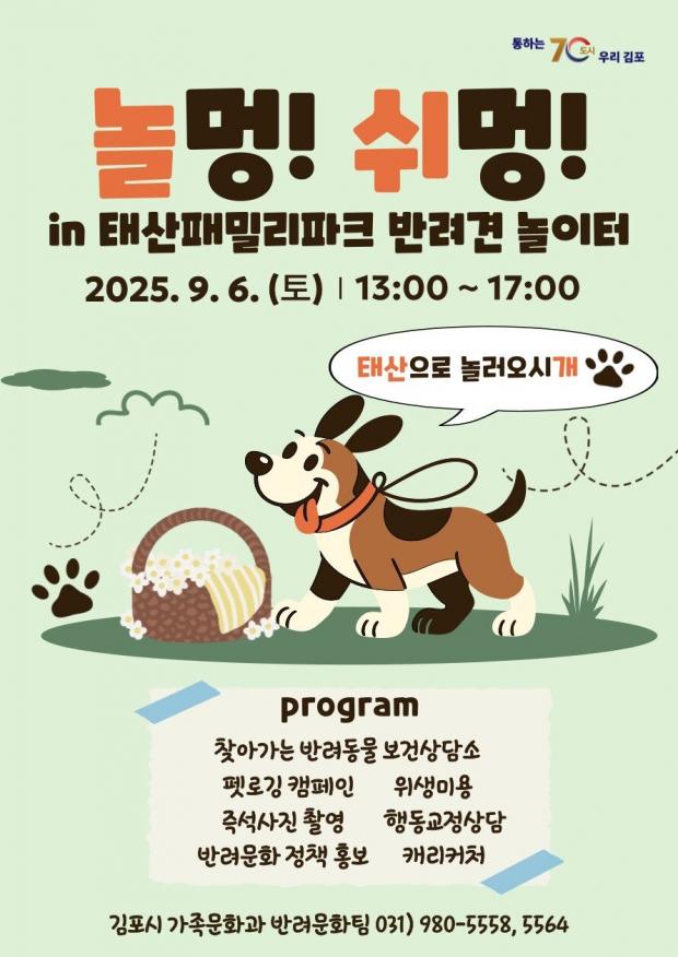 '놀멍! 쉬멍! in 태산패밀리파크' 관련 더 자세한 사항은 김포시 가족문화과 반려문화팀(031-980-5558, 5564)로 문의하면 된다.