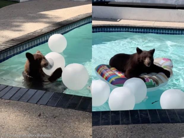 이 사연은 지난 3일(현지 시간) 미국 시사주간지 뉴스위크를 통해 알려졌는데요. 공개된 영상에는 큰 곰 한 마리가 수영장으로 뛰어들어 컵케이크 모양 튜브를 타고 더위를 식히는 모습이 담겨 있습니다.