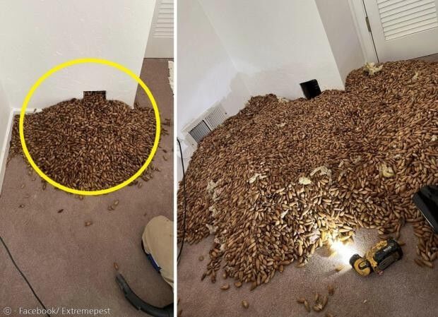 [노트펫] 미국 주택 벽 안에서 317㎏ 넘는 도토리가 쏟아져 나와서, 20년 넘는 방제업체 전문가도 혀를 내둘렀다. 안타깝게도 딱따구리들이 겨우내 모은 양식이 코인처럼(?) 물거품이 됐다.