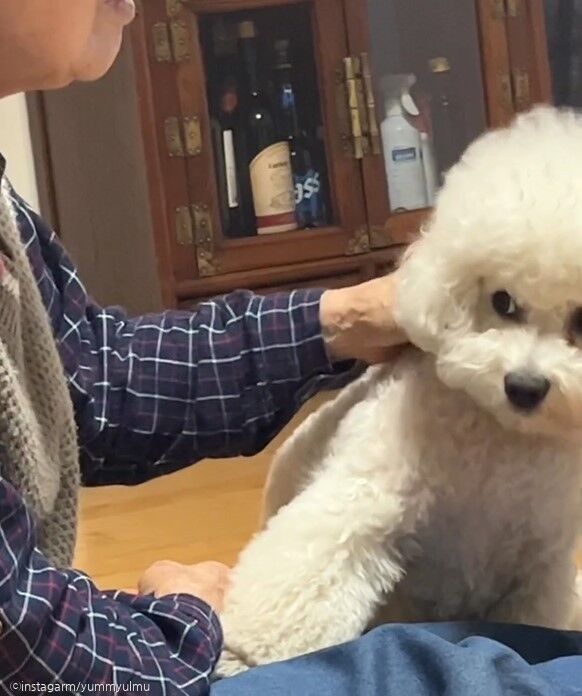 할머니랑 어색한데 주물러주는 손길이 나쁘지 않은 강아지