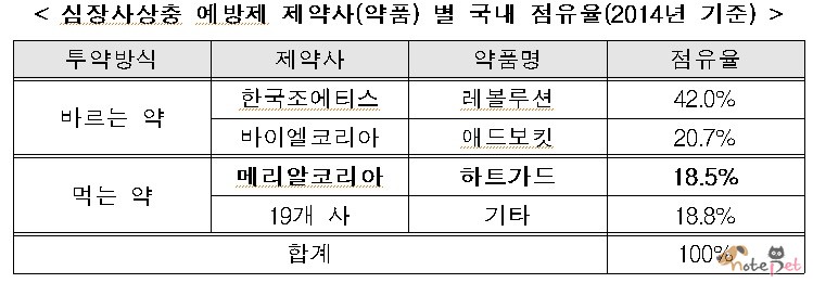 국내 심장사상충 예방제 시장은 2014년 기준, 130억 원 규모로 꾸준히 성장해 왔으며, 메리알 등 주요 3사가 80% 이상의 점유율을 장기간 유지하고 있다.