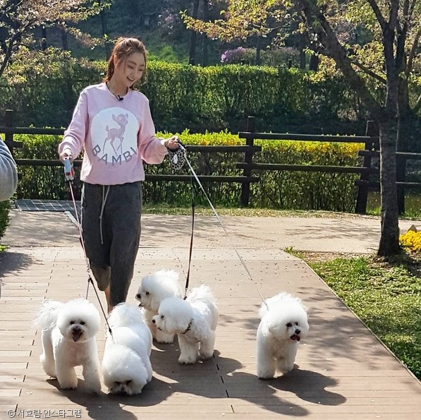공개된 사진에는 편한 옷차림의 서효림과 그녀의 다섯 비숑프리제 복순이, 지아, 노아, 리아, 코비가 함께 산책하는 모습이 담겼다.