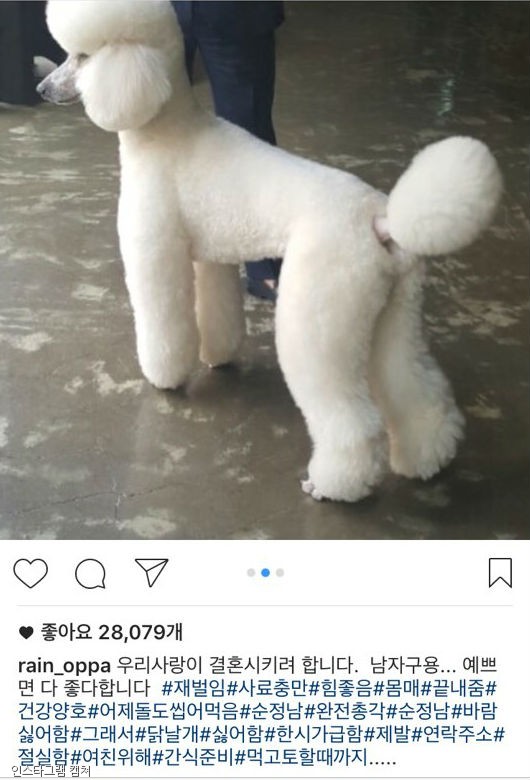 그는 스탠다드 푸들인 '사랑이'의 구혼 의사를 밝히며 "우리 사랑이 결혼시키려고 한다. 남자구용... 예쁘면 다 좋다 합니다"라고 적었다.