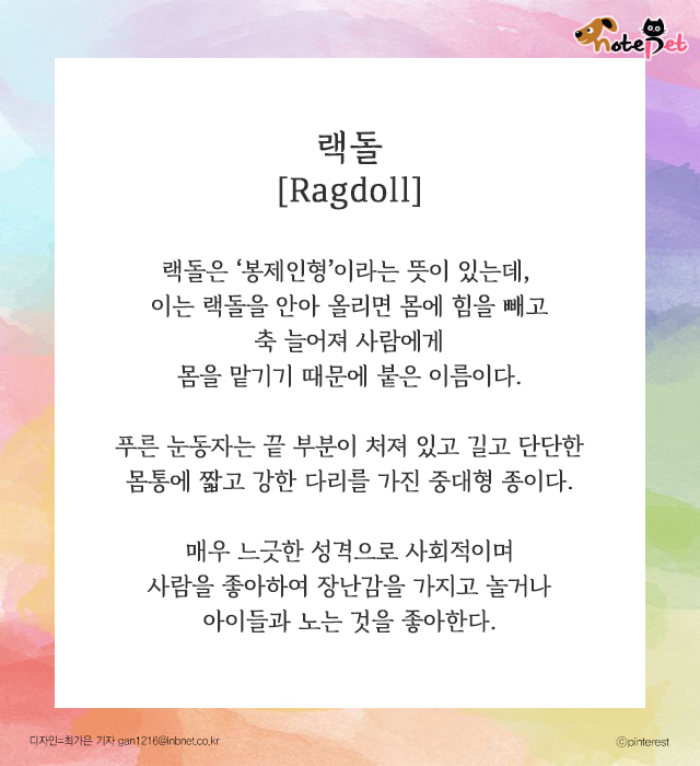 인형 미모를 가진 고양이 작성일 : 2018.07.24 23:00:00 7 최가은 기자 gan1216@inbnet.co.kr 이전 다음 1/10 랙돌 [Ragdoll] 랙돌은 ‘봉제인형’이라는 뜻이 있는데, 이는 랙돌을 안아 올리면 몸에 힘을 빼고 축 늘어져사람에게 몸을 맡기기 때문에 붙은 이름이다. 푸른 눈동자는 끝 부분이 처져 있고 길고 단단한몸통에 짧고 강한 다리를 가진 중대형 종이다. 매우 느긋한 성격으로 평소에느릿느릿한 걸음걸이로 움직인다.사회적이며 사람을 좋아하여장난감을 가지고 놀거나 아이들과 노는 것을 좋아한다. ⓒ 반려동물 뉴스 노트펫, 무단전재 및 재배포 금지