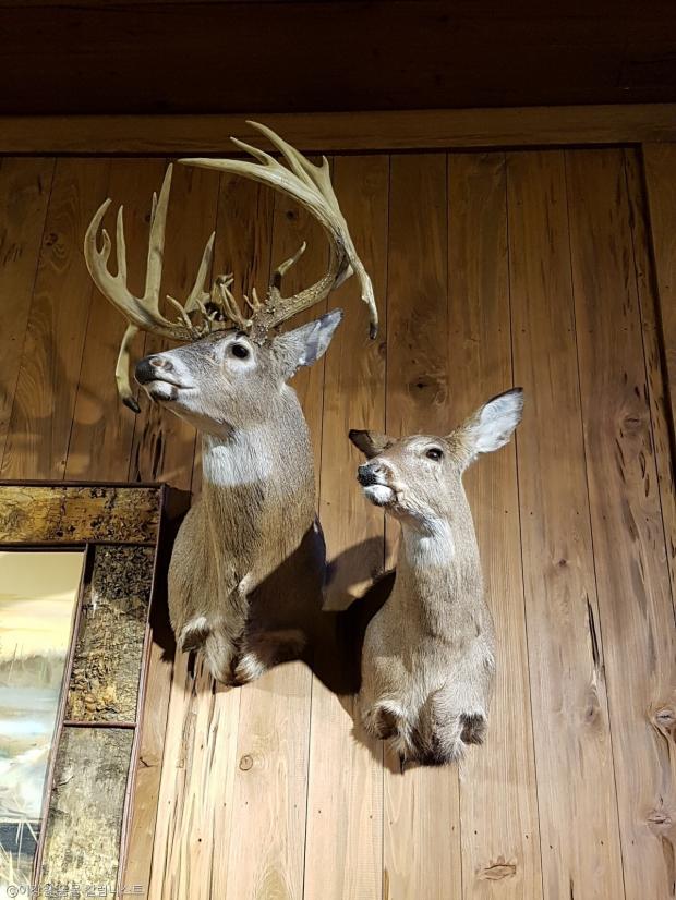 | 엘크들로 만든 트로피. 사진 왼쪽의 뿔이 있는 것이 수컷, 오른쪽의 뿔이 없는 것이 암컷이다. 2017년 멤피스의 한 호텔 입구에서 촬영. |