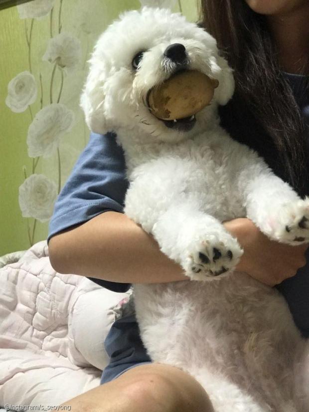 이어 "아버지가 시골에서 감자 한 상자를 받아오셨는데, 그 상자 안에 있는걸 어찌어찌 하나를 물어왔다"며 "흙도 다 묻어 있는 거라 놀라기도 하고 너무 웃기기도 해서 사진을 찍고 바로 뺏었다"고 덧붙였다.