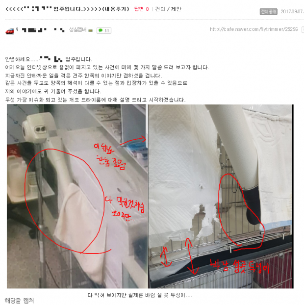 업체는 애견용 드라이룸이 아닌 일반 케이지를 애견패드로 막아 만든 개조 드라이룸 안에서 강아지 털을 건조시킨 것으로 알려져 파문은 커지고 있다.