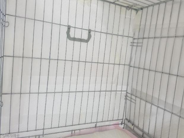 | 방울이가 들어가 건조된 개조 드라이룸, 케이지 4면이 애견패드로 둘러져 있다 |